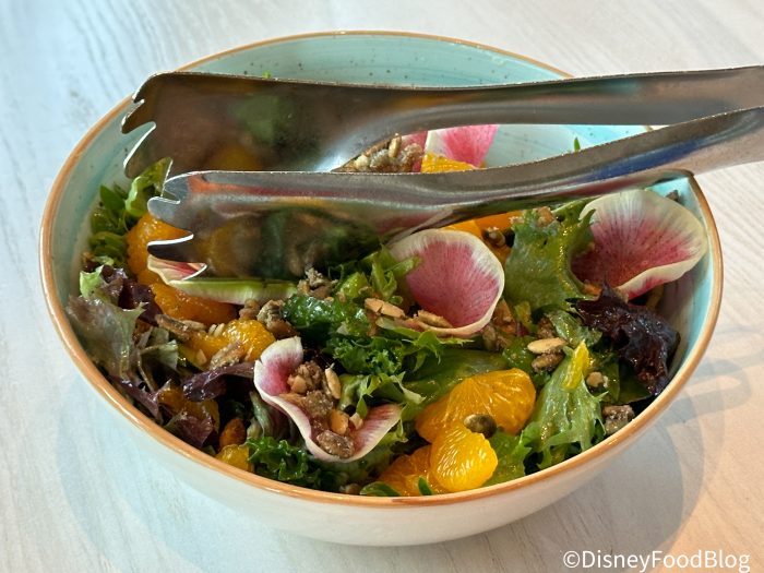 Ok, we’ve got to talk about this beautiful salad first! The Spice Necklace Salad is made of Mixed Greens and Kale with Spiced Candied Pumpkin Seeds, Tropical Fruit, and Radish with Key Lime Dressing.