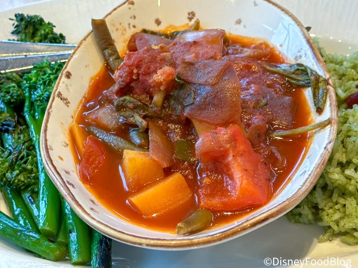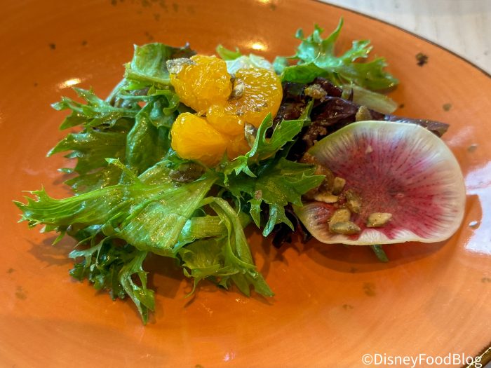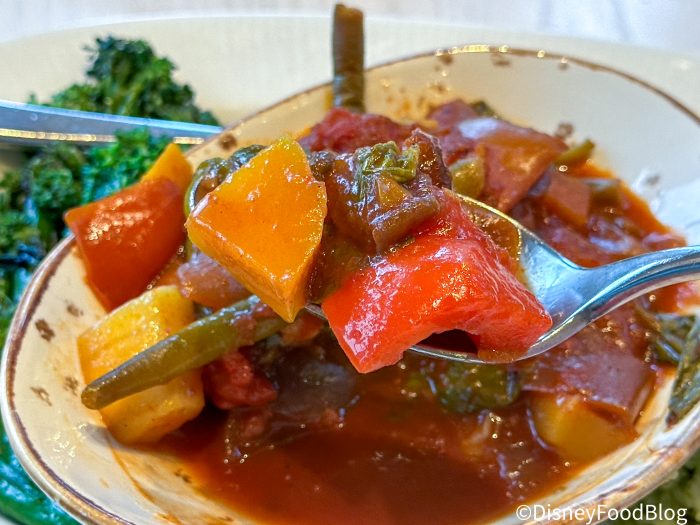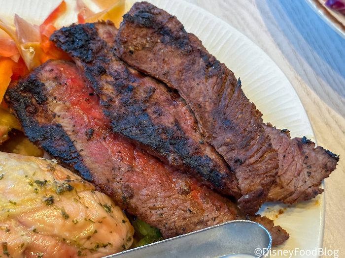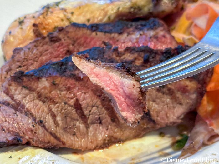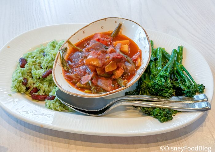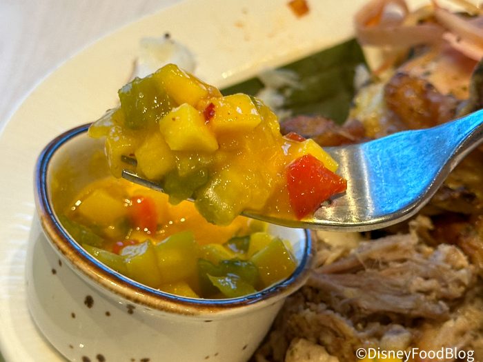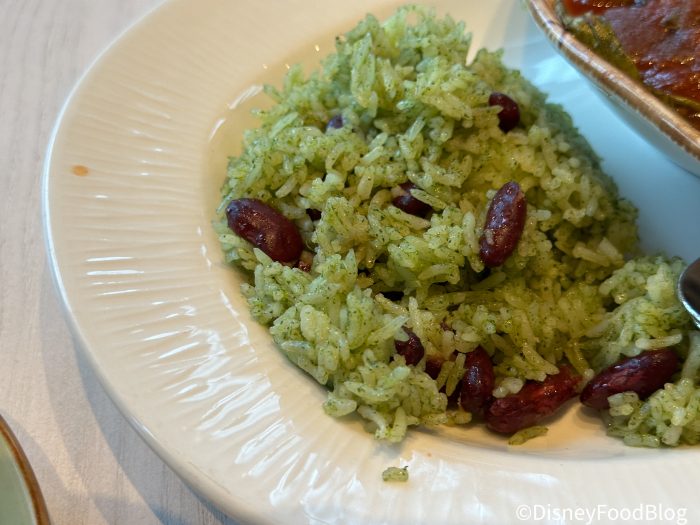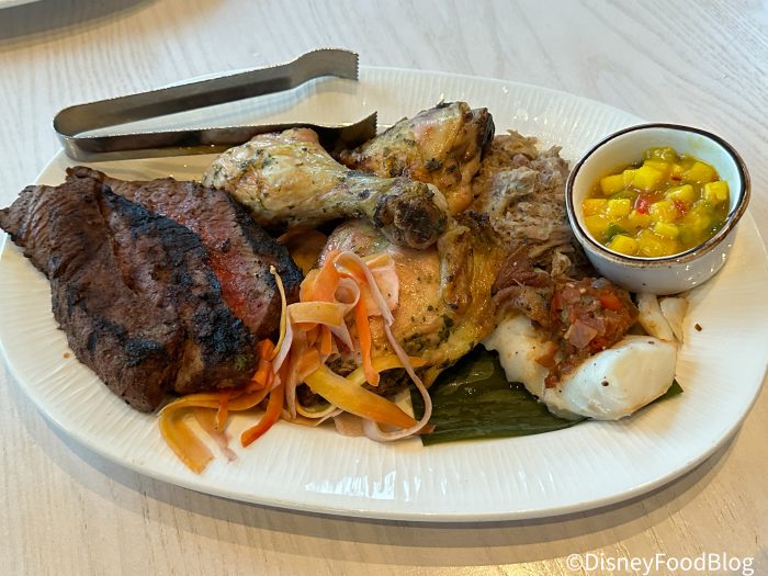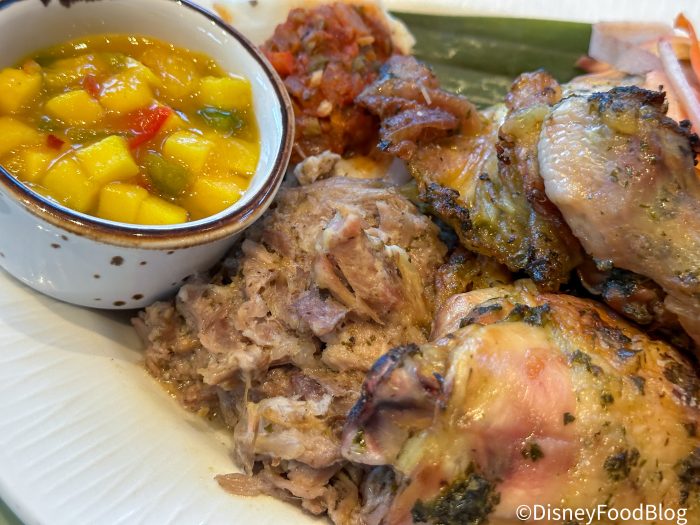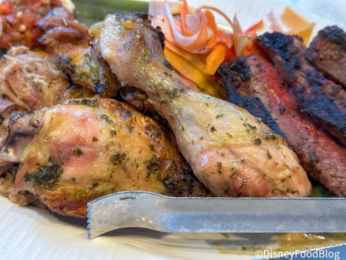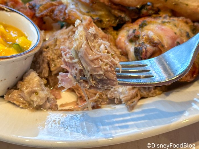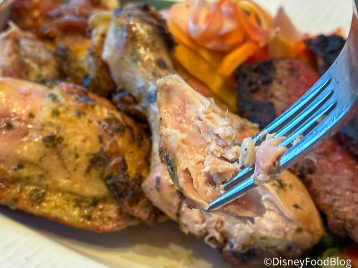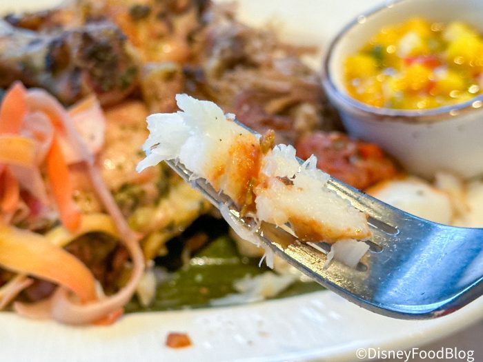 We’ll break this dish down one by one, starting with the over-roasted citrus chicken. This may be one of our favorite flavors of chicken at Disney World. The chicken drumsticks and breast are tossed into great buttery spices, and the skin with the meat really added to the overall flavor. If we had to be nitpicky about this one, it’s that we found the inside to be a bit dry and would have loved to have had a bit more juicy meat against so many of the flavors that started off strong on the outside.