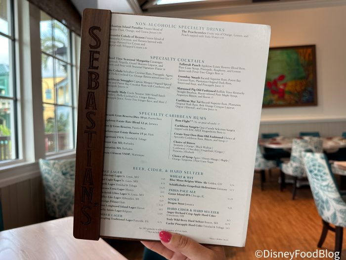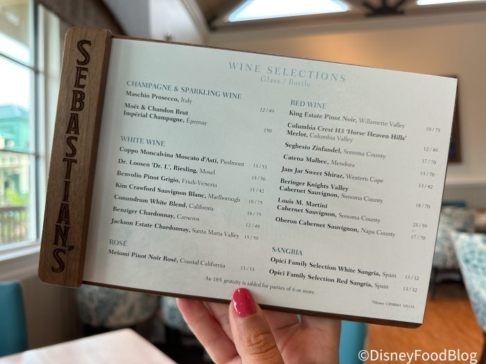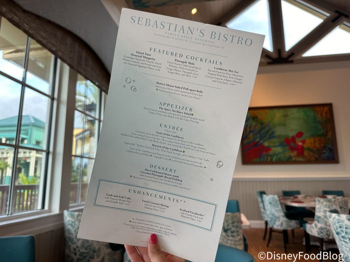 Sebastian’s Bistro is nestled along the backside of the check-in building that houses Centertown Market at Disney’s Caribbean Beach Resort. Its building is also attached to the neighboring Banana Cabana Pool Bar & Lounge. This moderately priced meal is served family style (meaning they have a set menu that’s brought out to your table and you can ask for more servings as your meal progresses) with a few appetizers to get you started, enhancements to add on to your meal, several beverage options, and all of this will wind down your dining experience with an included dessert.