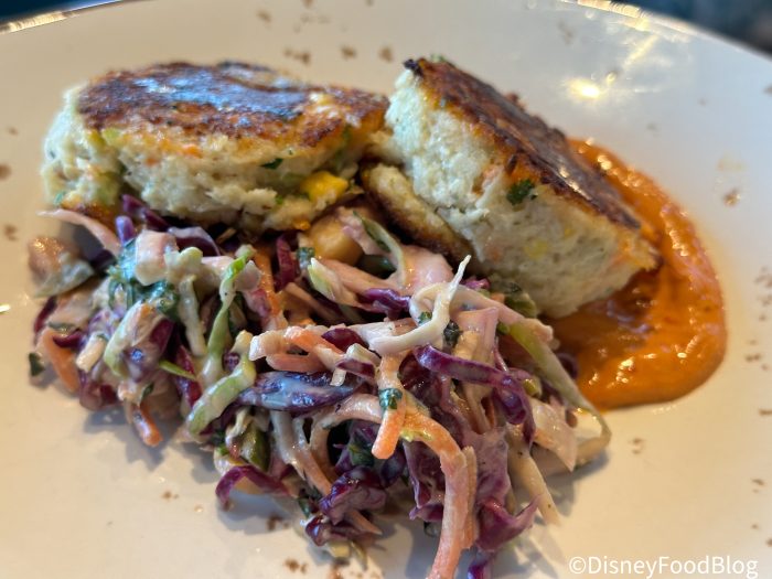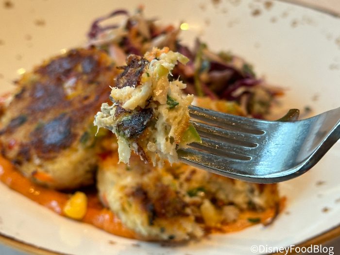 … revealed all the delicious seafood meat inside along with several crunchy veggies mixed in. You may need to get creative with this one because it will fall apart easily once you’ve started cutting into it. The flavor is put on full force when you’re able to get some of the mango slaw (which really DOES taste like mango) and the aïoli sauce.