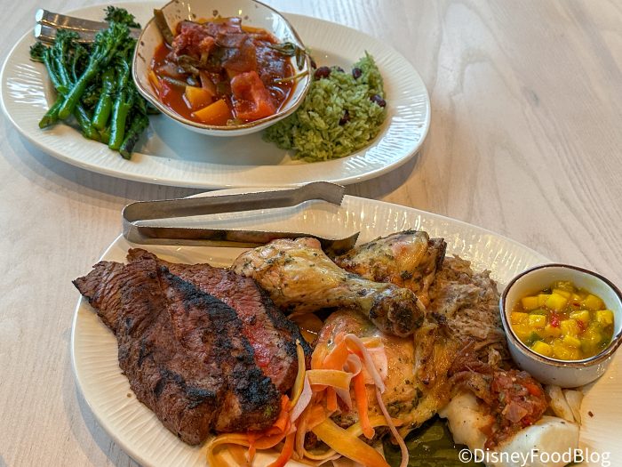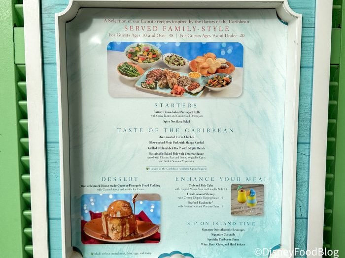 As we mentioned before, this meal is served family-style, meaning the entree is brought out to your table and replenished as you request more things so that helped to narrow down our choices. However, there is an option called Harvest of the Caribbean that can be enjoyed if you would rather opt for the plant-based version of the meal. Either version of the main entree will cost you the same price of $38 for adults and $20 for children ages 3-9. This price will include all the appetizers, either version of the shared entree meal, and dessert.