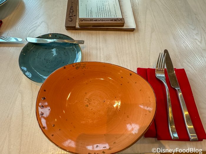 After we were seated, we were offered a table setting with a main dinner plate, rolled silverware in a cloth napkin, and a smaller plate in anticipation of appetizers.