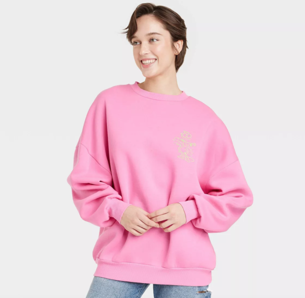 This comfy pink sweatshirt with Disney Minnie Mouse graphics is SO bright and cheerful. It’s made with a midweight fabric, so you can wear it to the Disney parks in the winter or lounge at home!