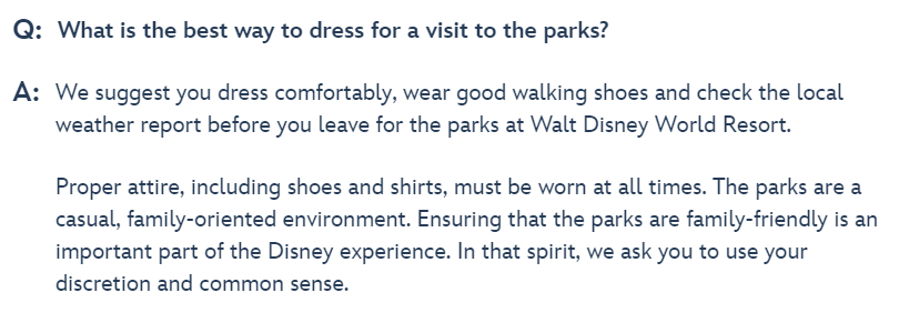 Yes, believe it or not, Disney World does have a dress code. You must wear “proper attire” when visiting the parks. That means shoes and shirts must be worn at all times. Disney also asks visitors to “use your discretion and common sense” with what they wear to the parks because the environment is family-friendly.