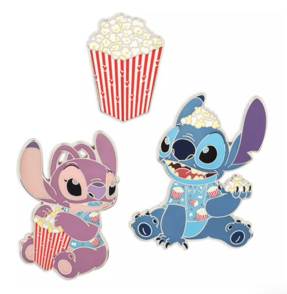The new pin set includes three different pins: one of Stitch, one of Angel, and one showing a popcorn bucket. This is definitely a must-get if you’re a fan of pin trading in the parks!