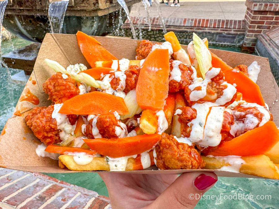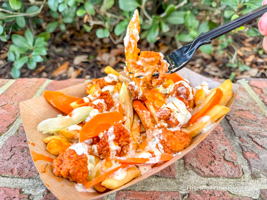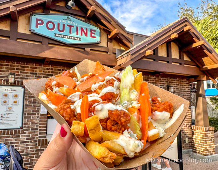 We stopped by The Daily Poutine in Disney Springs to check out something NEW on the menu — the Buffalo Chicken Poutine! For $10.49, you get french fries covered in buffalo chicken tossed in hot sauce with carrots, celery plants, and garlic ranch dressing. What’s not to love about this?