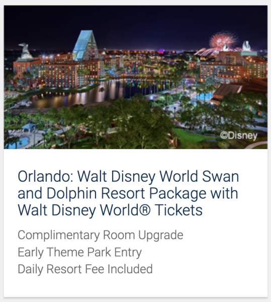 Don’t worry, Florida hasn’t been left out! There are lots of different deals for Disney World, but one of our favorites you need to know about is the Disney World Swan and Dolphin Package, which gives you a complimentary room upgrade, Early Entry, and the daily Resort fee is included.