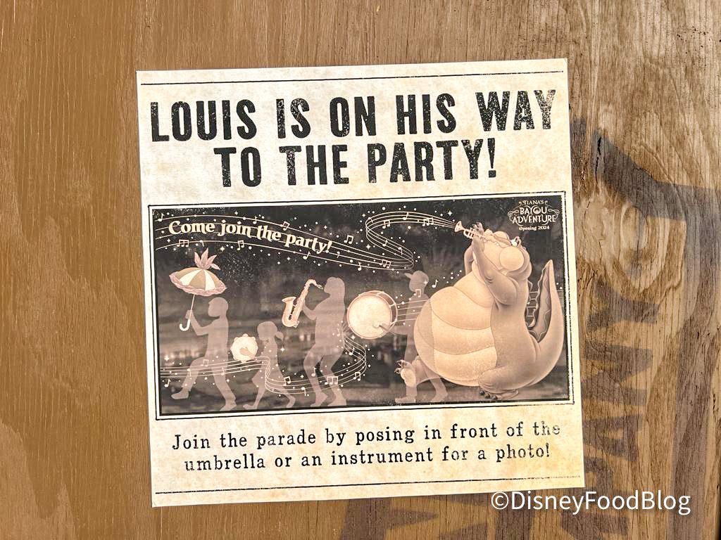 There is also a sign that says “Louis is on his way to the party,” and says to join the parade by posing in front of the umbrella or instrument for a photo. This is referring to the mural, which can totally be used as a photo op. Is it also a hint at a photo op that can be found inside the queue later on?