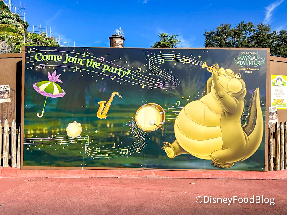 On February 13th, we noticed that some new signage had been placed around Tiana’s Bayou Adventure! Firstly, there’s a new mural situation, which features Louis the alligator. The sign helps a lot, as it features the ride’s name. Tiana’s Bayou Adventure does sound more like a ride than “Tiana’s Foods.” We can see where the confusion came from.