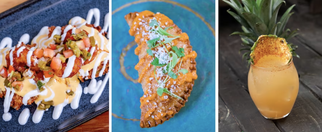 - Cantarito-Style Paloma: Reposado tequila, habanero-infused pineapple juice, lime juice, rock melon syrup, and Fresca garnished with a pineapple wheel and Tajín Clásico