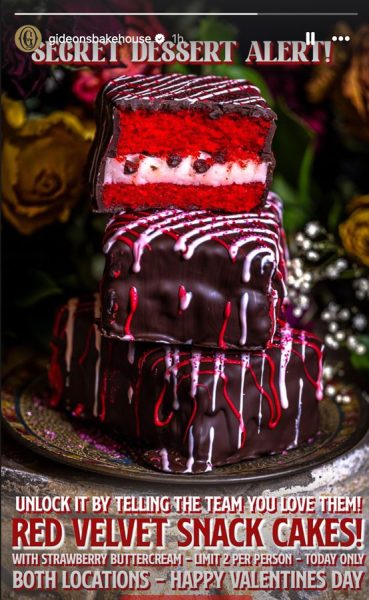 So what you’ll want to do is head to Disney Springs and make a beeline for Gideon’s Bakehouse — yep, you know the place because we talk about it A LOT. We can’t get enough of those cookies, after all! There’s a special snack available there: Red Velvet Snack Cakes with Strawberry Buttercream. OH, YEAH. But you can only get these snack cakes if you do one thing…