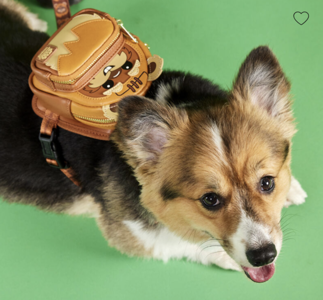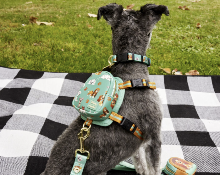 Your pup can wear these Mini Backpack Dog Harnesses like normal harnesses (they have adjustable straps), but the harness has a Loungefly bag-shaped pouch attached to the top! The pouches have zippered pockets to carry treats, poop bags, or any essential you want to take with you. They also have leash hooks on the bottom of the bags, and each comes in sizes Small, Medium, and Large. Let’s check out the designs!