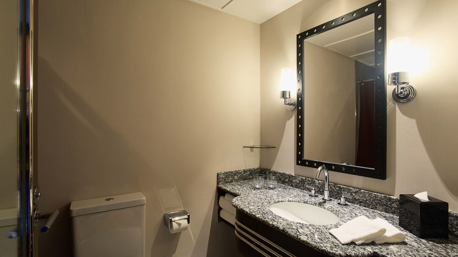 The bathrooms have also been upgraded — the mirror has a fun filmstrip-inspired frame. That’s because the overall concept for the hotel is Hollywood!
