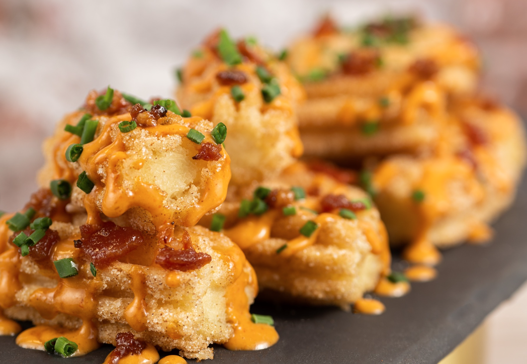 And, you can also order the Bouncin’ Mini Churros. These savory churros are topped with Coca-Cola and bourbon candied bacon, sriracha aïoli, and scallions.