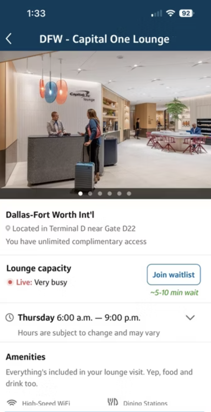 Capital One cardholders can now request to join the airport lounge via a mobile waitlist! These waitlists are accessed through the Capital One mobile app (specifically in the Travel page within the Explore Rewards & Benefits section), and allows cardmembers to skip the wait for the lounge in entirety, according to Simple Flying.