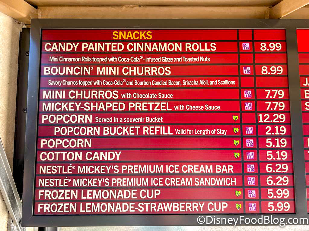 On the menu, we’ve got some new snacks, as well as some classics like popcorn, Mickey Premium Bars, and cotton candy.