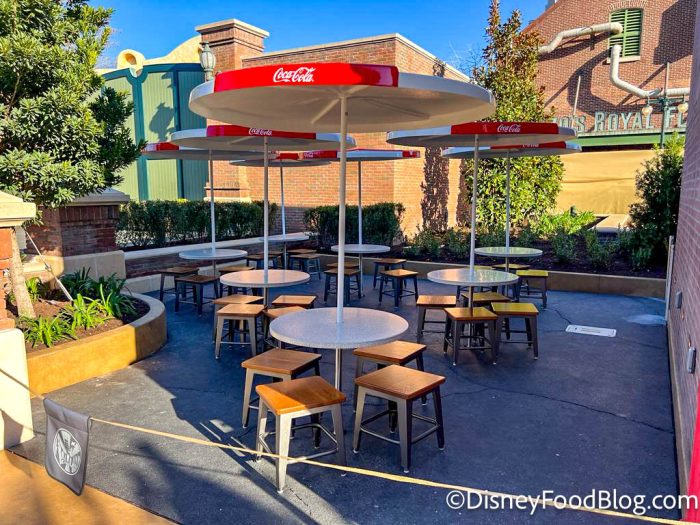 Next to the snack stand is a brand-new seating area with a few outdoor tables. They’ve all got umbrellas, which will be nice on those sunny days.