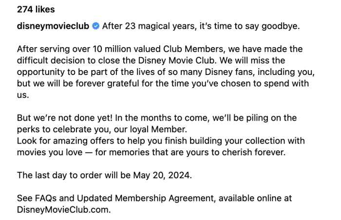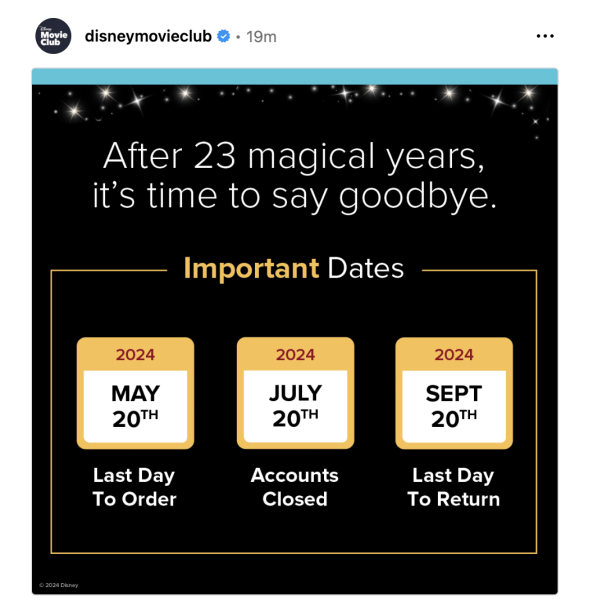 If you’re a Disney Movie Club member, the last day to order anything will be May 20th, 2024. Accounts will be closed automatically on July 20th, 2024, and the last day to return films will be September 20th, 2024. However, to honor members’ loyalty over the years, the club will be releasing tons of perks to help collectors finish out their collections before the final day of sale.