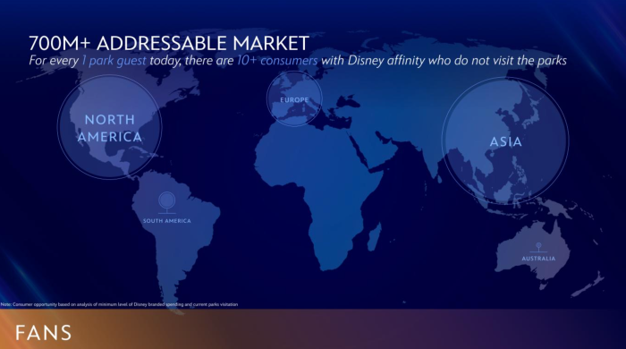 Bob Iger has said that Disney is “looking… expansively” in India and “considering our options there.” CNN and industry insiders think that the deal between Disney and Reliance could create a powerful couple that “goes beyond media, with industry insiders speculating about a combined push into theme parks.” When the $60 billion expansion plan as announced, Disney released this map which showed where its “addressable market” lives. Notice that the biggest population of people with a Disney affinity who do not visit the parks is in Asia.
