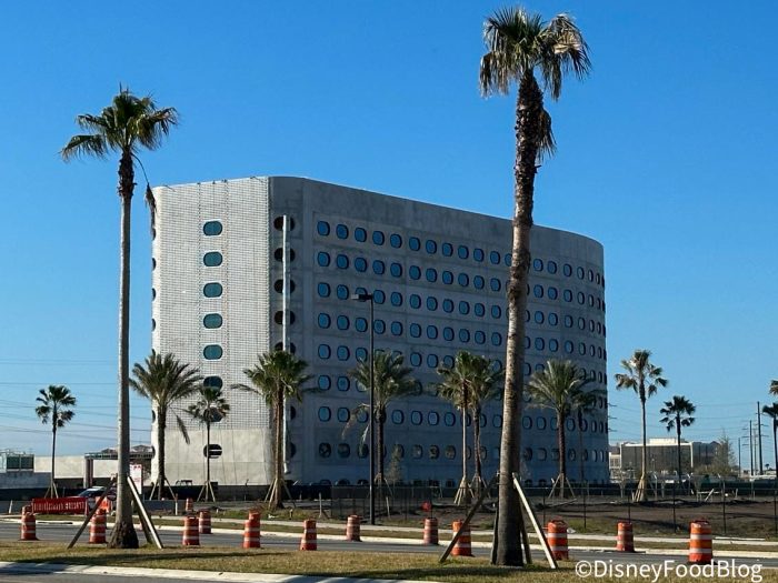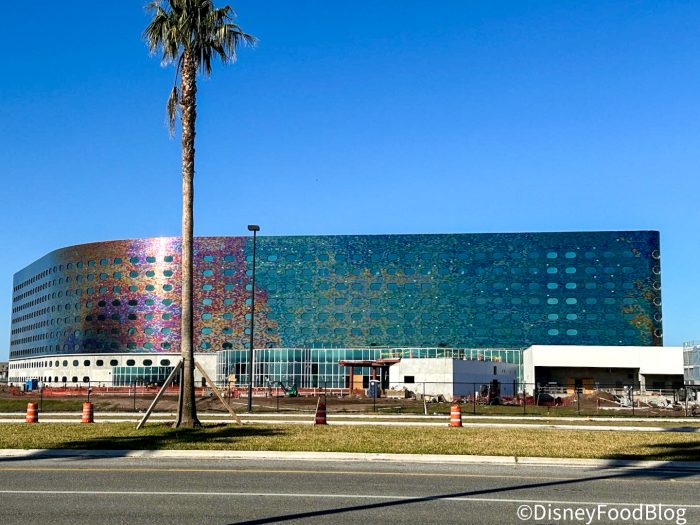 If you look in between the hotels, you can get a peek at the construction going on inside the park, too! We caught a glimpse of the coaster track for Starfall Racers and a few exterior details for the surrounding area.