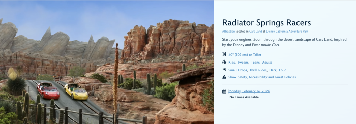 Radiator Springs Racers closed for refurbishment in Disney California adventure on February 26th! Remember this is planned to be a short closure and should reopen on March 2nd. We’ll definitely update you if there are any changes to the refurb schedule!