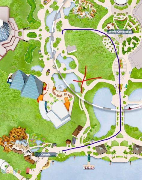 We do have to break some bad news though, while this area is getting ready to open up, we spotted some more construction walls today blocking a pathway from World Nature to World Showcase. Here is a quick peek at the area we are talking about. The red X is the pathway that got some new construction walls around it: