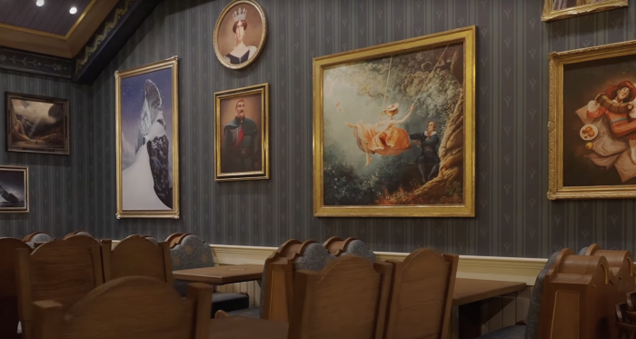 It looks like there are a few different dining rooms inside, with one that looks like the Great Hall and another that looks like the art gallery (where Anna sings “For the First Time in Forever” in the movie).