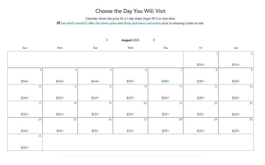 Still, the lowest price of 2025 which is a $10 increase from the lowest price of 2024: $109. $10 per ticket can really add up, especially for larger parties, so it’s honestly a great thing that Disney let us know off these changes SOONER. That means we have plenty of time to budget! Oh, and if you do decide to visit Disney World during August, be prepared for some HEAT. This is one of the HOTTEST months of the year in Central Florida, and you’ll want to make sure to plan some comfortable and breezy outfits as well as extra supplies to stay hydrated.