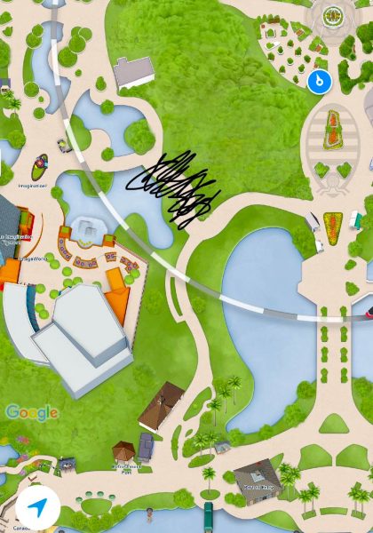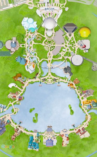 For reference, we’re looking at the zoomed-in part of the EPCOT map that’s close to the Imagination pavilion. Here’s a zoomed-out map of EPCOT — the section where the shortcut is closed is right next to the Imagination pavilion, in the middle/left part of the map.