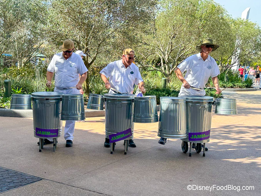The Jammin Gardeners are performing rhythmic beats with inspired backyard percussion over near World Celebration Gardens.