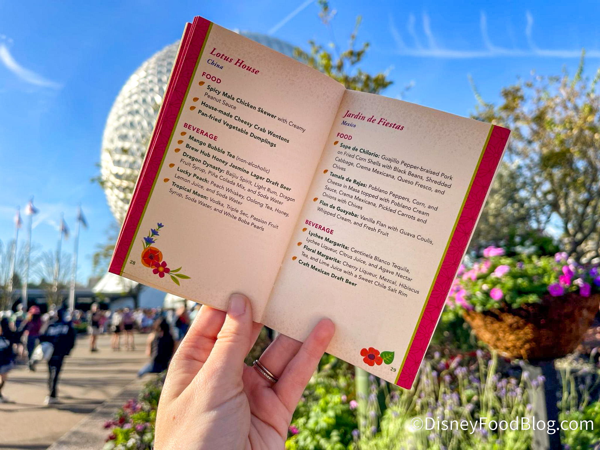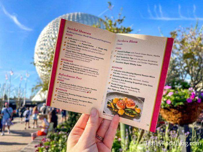 And now, for our personal favorite here at the DFB…the Outdoor Kitchen pages! Every food kitchen is listed in the Passport along with where you can find each of them, all of the menu items, and the ingredients for each item. First up, we have the special offerings from the Joffrey’s Coffee & Tea Carts. There are four locations around World Showcase and World Discovery offering special drinks!