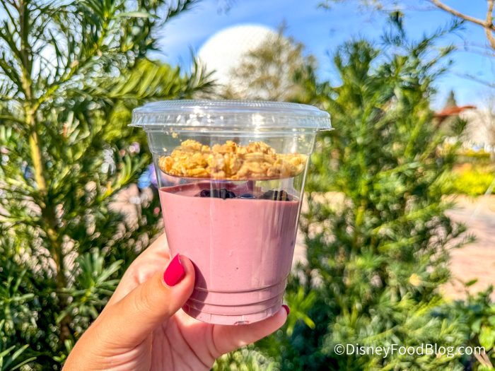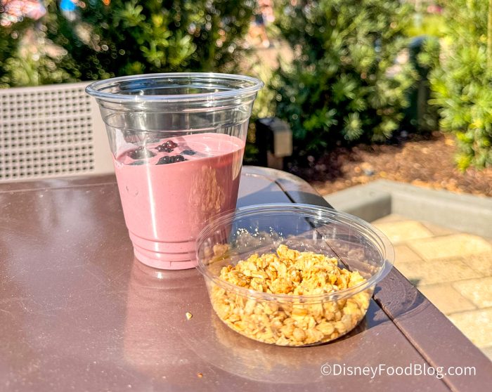 Next, we checked out the Açaí Parfait with Greek yogurt, fresh berries, and granola This dish is priced at $4.75 and is also a snack credit on the Dining Plan. The granola comes in a little separate container. We will warn you that this melted fast on us!