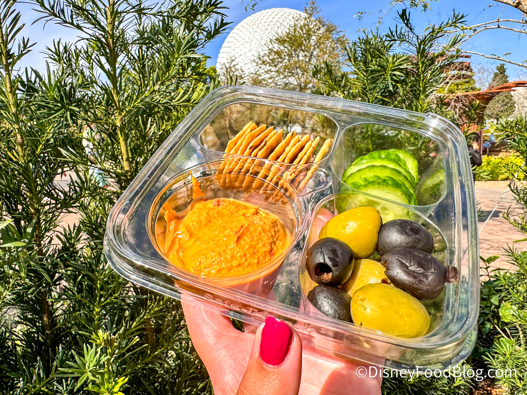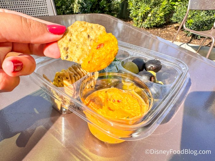 First up, we grabbed the Roasted Red Pepper Hummus with cucumbers, olives, and multigrain crackers. This dish is $5 and is also eligible as a snack credit on the Disney Dining Plan. This is literally like one of those Kid’s packs you get. We will say that the olives and cucumber were fresh. The crackers were sesame crackers with a nice saltiness with a crisp crunch.