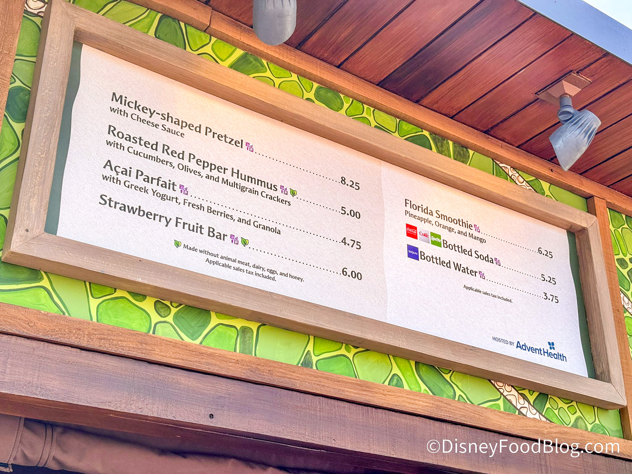There is one festival drink here — the Florida Smoothie for $6.25 is made with Pineapple, Orange, and Mango. So we’ve got what we’re going to call a POM smoothie, which is like a POG smoothie, but with mango instead of guava. This baby is FRUITY and a lot of fun. If you like fruity treats or sweet smoothies, this is for you. And if you’re a big fan of POG juice, we think you should give this a try. It’s very similar but with a fun little twist. We also think the presentation was top-notch.