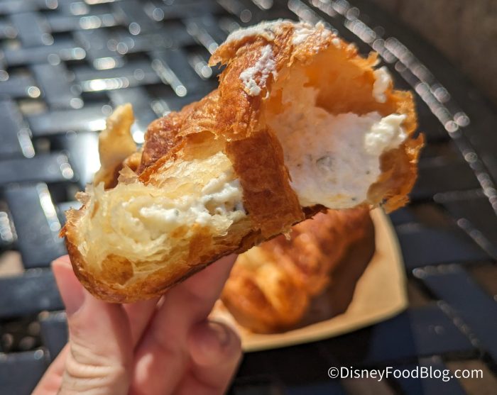 This beignet is more like School Bread at Kringla Bakeri Og Kafe in the Norway Pavilion than a classic Mickey Beignet, as it is very bready with a regular diner roll texture but sweet. Inside, you’ll taste the perfect amount of vanilla cream while the outside features a phenomenal cracked sugar caramelized topping to really complete that amazing crème brûlée texture and flavor.