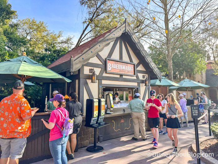 We’re talking about Bauernmarkt: Farmer’s Market — one of the Outdoor Kitchens (also known as Food Booths) at the park’s springtime celebration! You’ll find this booth nestled in the Germany Pavilion as you stroll around World Showcase, enjoying the Festival’s famous Disney topiaries, garden displays, and entertainment. Join us as we review Bauernmarkt to see if it lives up to its reputation as a deserving fan-favorite booth once again this year!