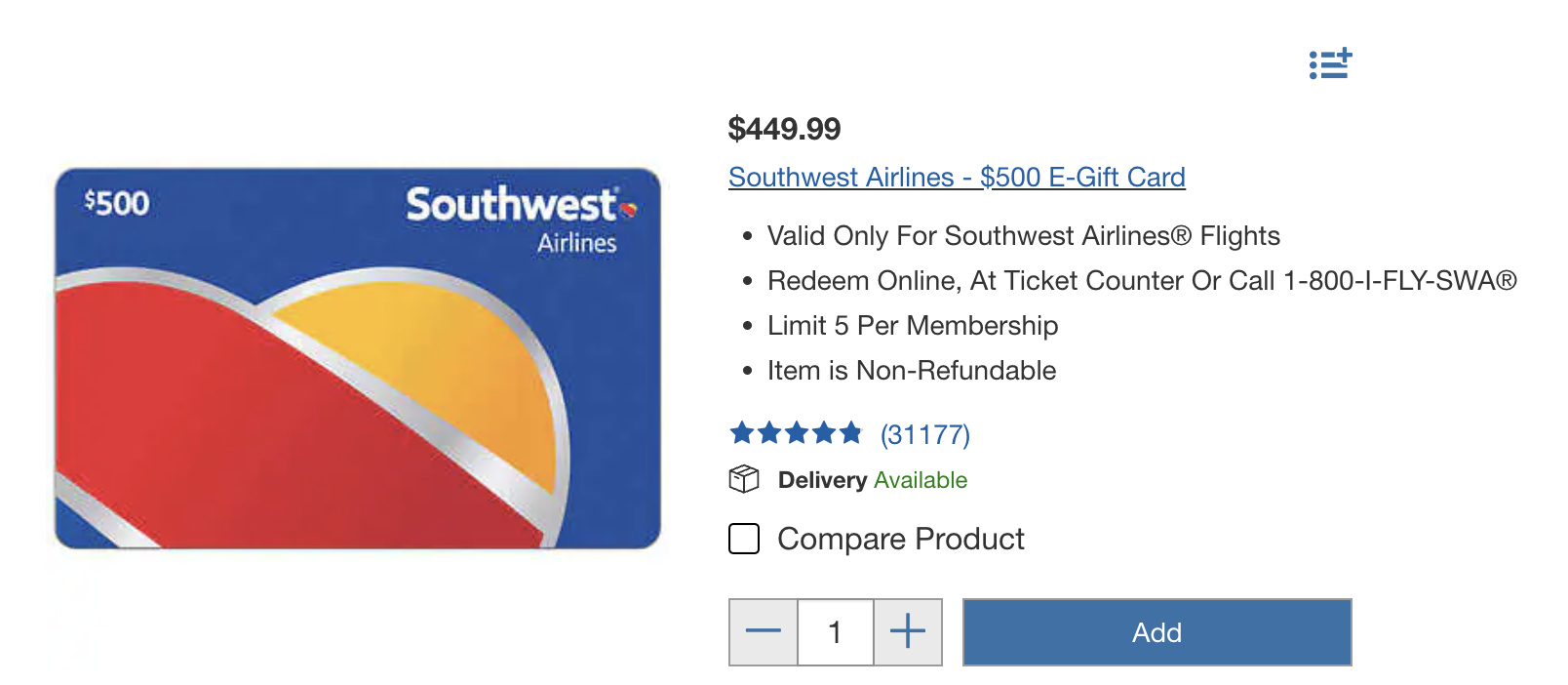 Costco members can often save on packs of gift cards, and some of these can really come in handy when you’re planning for your trip! For example, if you’re flying Southwest, grab a $500 Southwest Gift Card for just $449.99!