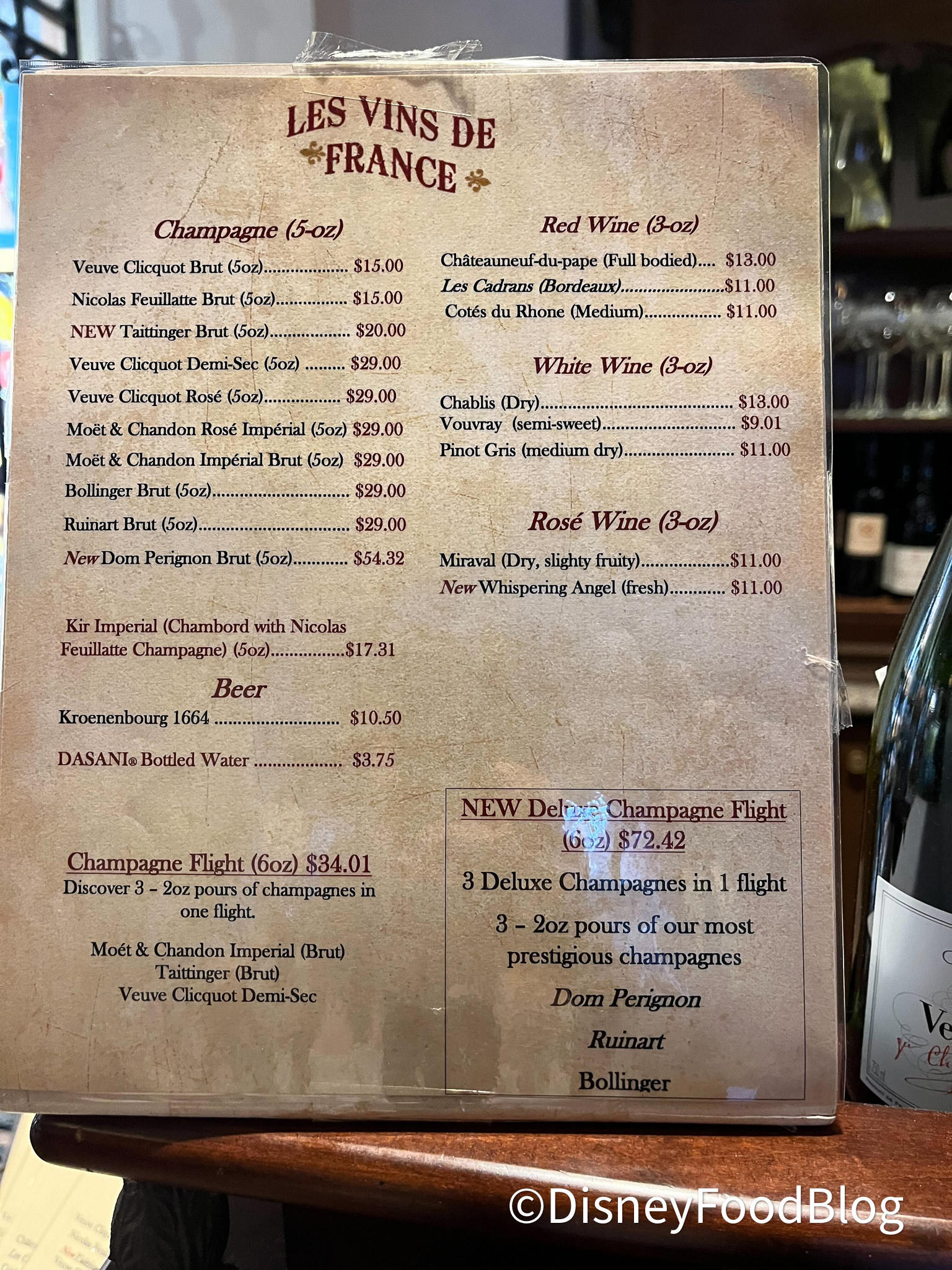 At the wine shop Les Vins de France, you can not only buy bottles to take home, but also wine by the glass to enjoy in EPCOT! You can choose from an array of champagne as well as different wines. What makes this place extra special and unique is their champagne flights!