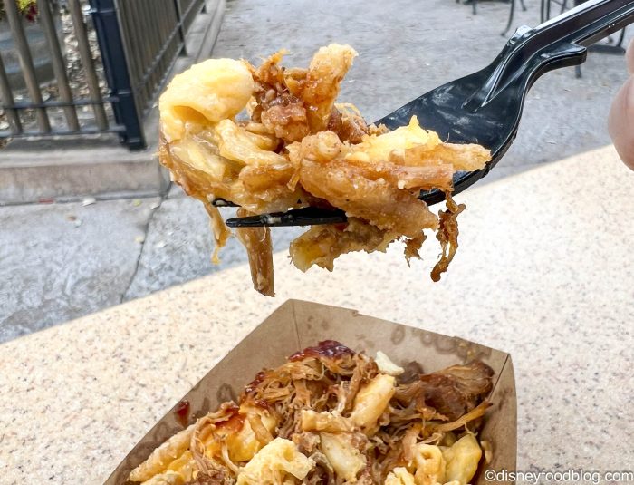 This dish, as it claims, sports BBQ pulled pork, macaroni and cheese, and is topped with crispy dill pickle onions.
