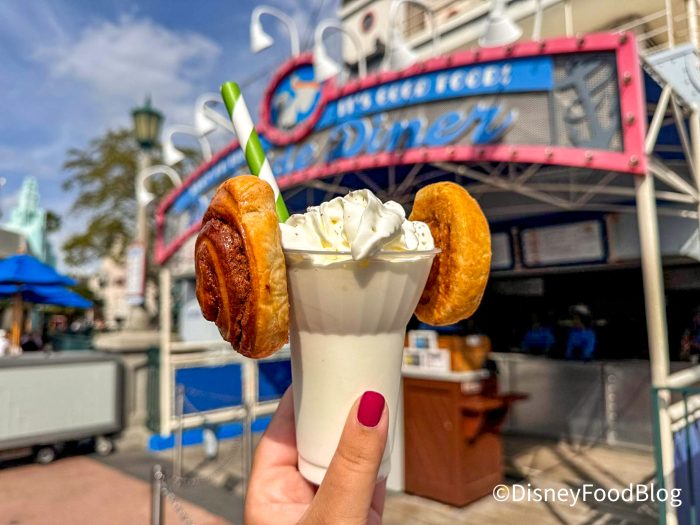 After EPCOT, it was time for Disney’s Hollywood Studios where you can find the Princess of Alderaan Shake at Dockside Diner! This is a salted caramel shake topped with whipped cream, edible glitter, and Leia’s hair buns… ah, we mean cinnamon rolls.