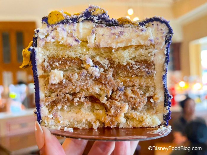 Moms, this may be your new nemesis, because it will stain anything your child touches after they’ve been holding this cake! But the “blurple” coloring aside, we noticed a neat flavor we don’t think we’ve tried in Disney before. It reminded us of Fruit Loops and blueberry in the lavender-white chocolate mousse.