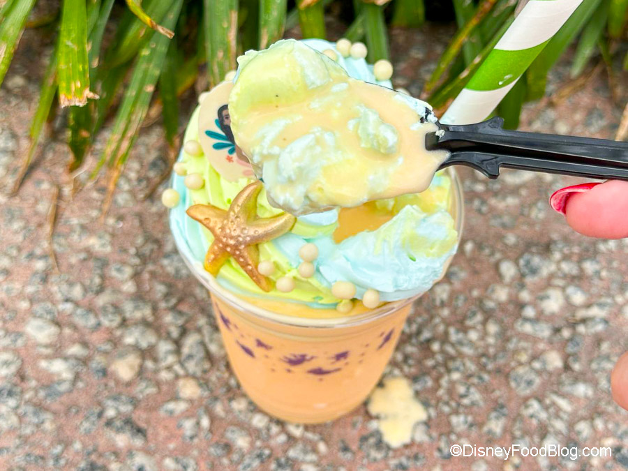 There is a LOT to get through here, though, but once you make it to the actual shake, it’s got a nice Creamsicle-like flavor. The pearls add a nice crunch, but the starfish, shells, and Moana coin are white chocolate pieces that melt in your mouth.