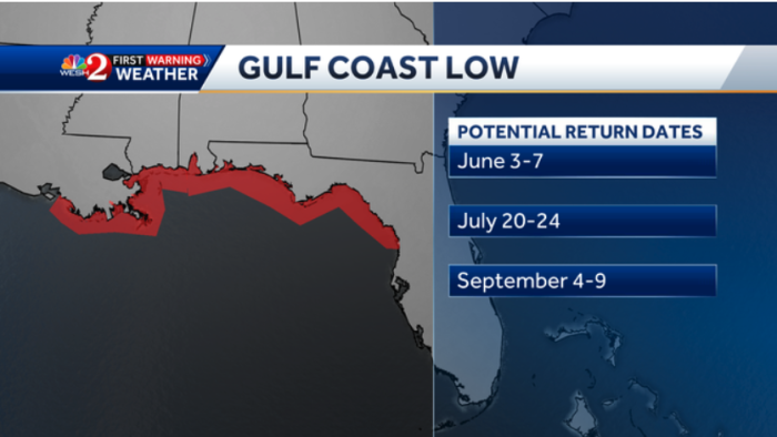 The possible return dates for the low Gulf Coast of Florida are June 3rd through 7th, July 20th through 24th, and September 4th through 9th.