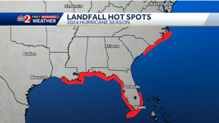 For the predictions this year, Burris began using a program in October and November of 2023 that runs through weather patterns in the area. Based on the data this system gathered, Burris has given us a look at the predicted hot spots for the upcoming hurricane season. The red shows the hot spots — areas that could potentially see impact from hurricanes.