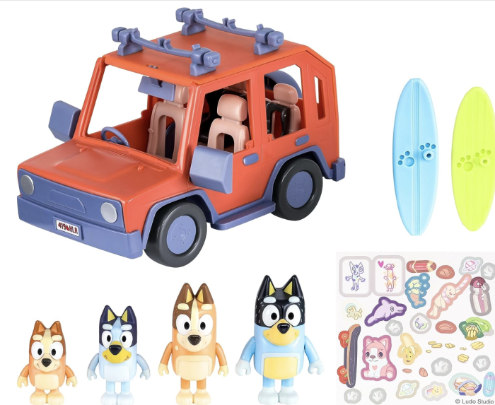 The Bluey car playset has figures of Bluey, Bingo, Bandit, and Chilli, along with a Heeler 4WD vehicle that fits the whole family inside. Also included are two surfboards and a sticker pack so your kiddos can decorate the car!