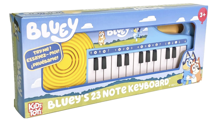 The Bluey 23-Note Keyboard is on Amazon, too! Kids can make up their own music and learn songs, and the keys light up as they play.