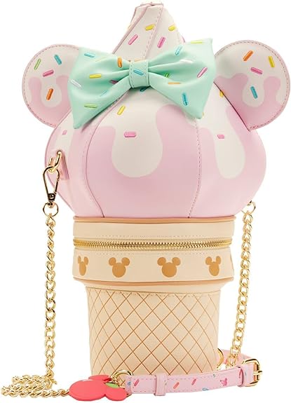 The Loungefly Minnie Sweets Crossbody Bag takes soft-serve to a whole new level! The crossbody bag is shaped like an ice cream cone with a whipped cream topping over a pink strawberry swirl. The bag features embroidered sprinkles, gold chains, adjustable shoulder straps, and a scented pink padded Mickey Mouse ears-shaped charm with a green stem. Each crossbody bag also comes with a matching enamel pin of a jar of sprinkles, as part of the Stitch Shoppe by Loungefly collection!