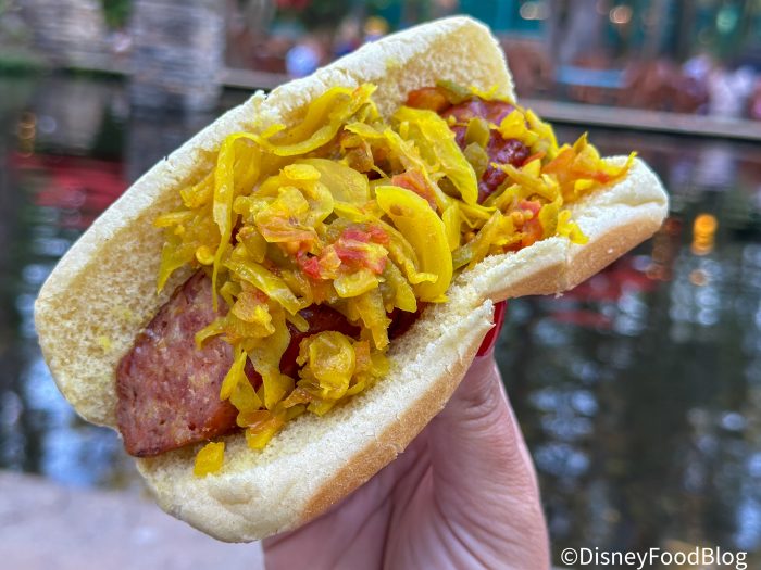 As for the sandwich, this was a smoked sausage topped with veggies in a hot dog-style roll.