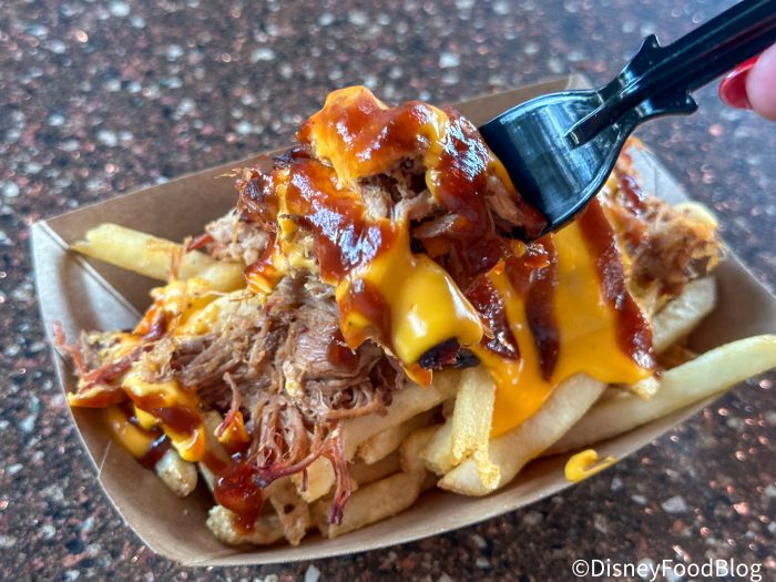It may not seem like it at first glance but this dish could stand alone as a meal itself! It’s so cheesy and tangy thanks to the barbeque sauce and the melted cheese that coats the top of the fries in our beloved melted cheese sauce (A.K.A. plastic cheese as we know it best). All of the gooey goodness is sitting on top of lightly salted Disney World french fries which are served warm to the touch, and we can’t think of anything else that could make them better.
