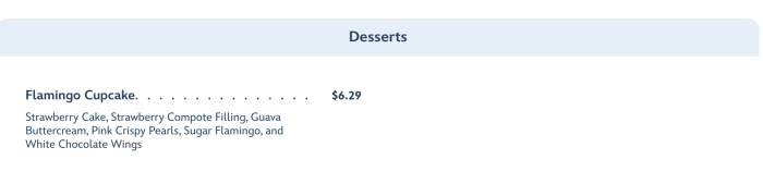 This plate is a lot of food — we often recommend sharing it! But keep in mind that the sides are small, so if you’re a big beans and slaw person, you may not want to share. We couldn’t have a full meal without a dessert, so we also picked up the Flamingo Cupcake for a sweet treat. This cupcake cost us $6.29 and is gorgeous!